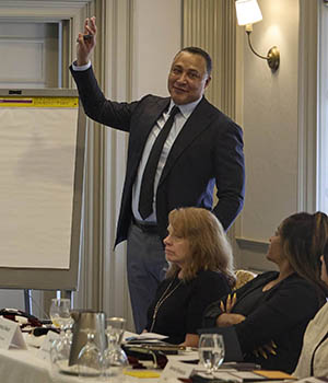 Dr. Antonio Oftelie, executive director of Leadership for a Networked World, speaks to cohort members at Harvard University. (Photo by Russ Campbell)