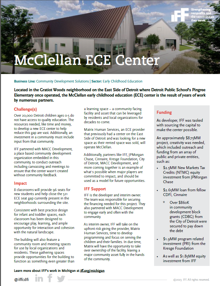 Rendering of the McClellan Early Childhood Center in development in the Gratiot Woods neighborhood of Detroit. Krista A. Jahnke Share Facebook Twitter LinkedIn Email IFF is developing the McClellan Early Childhood Education Center in the Gratiot Woods neighborhood of Detroit, backed by multiple capital sources, including a Kresge program-related investment. Matrix Human Services will provide services once the center comes online in 2024, with eight classrooms for 96 students. Kresge Communications Manager Krista Jahnke interviewed IFF’s Kirby Burkholder and Rick Raleigh to learn more about the creative financing and community development principles that went into building the new high-quality center. Kirby Burkholder, IFF president, Core Business Solutions Kresge: Sourcing $9 million for any project is a big task. What kind of creative challenges came in putting that capital together for the McClellan Early Childhood Education Center? IFF: The creative challenge stemmed from the lack of an obvious path from A to Z. Each component, such as community development block grants, the PRI partnership with Kresge, and equity contributions, required proactive and patient work to bring together. The interdependence of each part demanded a vision to weave them together effectively. There is a world of options, but how do those pieces fit together at the right time? In the right ways? That is a difficult needle to thread. Rick Raleigh, senior project manager Kresge: Take us from point A through the zigzag moves you had to make to get to Z. IFF: Initially, the project started with IFF’s equity and land. We bought a piece of property in 2019 with a vision of responding to ECE needs in Detroit. We had a partner we were working with, a provider to run the center, and we’d spent quite a bit of money on design. But then, the COVID pandemic forced the provider to walk away. Luckily, we’d focused on best practices in the design process, which spared us from having to go through a long redesign, but there were still sunk costs and delays. Kresge: How did community development block grants (grants from the federal Department of Housing and Urban Development) come into play? IFF: From the beginning, we had a commitment of IFF equity as part of IFF’s long-term commitment to Detroit. We also had confidence that Kresge would invest through a PRI to bring the project to life as part of its comprehensive commitment. We then went after the CDBG dollars and asked for $2 million and ultimately got $860,000. When you get a CDGB grant that small for a project this large, there are some cost-benefit considerations. We can only use it for certain purposes, and there are compliance and procurement requirements that could, ultimately, bring a net loss to the project. We had to be purposeful and coordinated on the project layering and leverage. Kresge: Were there other big challenges? IFF: We had to be patient. You’re working through all the issues of buying a property in Detroit. The building had historical issues related to property ownership. That takes time. Then there was myth-busting. There was confusion at the City Council about who IFF is: why were we, a “Chicago-based” developer, doing this? We had to make our case that we’ve been in Detroit a long time. With the machinations of acquiring the CDBG, our provider stepping away, the myth-busting we had to do, and the delays — most developers would walk away. It was a roller coaster. We then applied for highly competitive New Market Tax Credits, but with the timing and layering limitations of the CDBG, that was also a big hurdle. We made it to closing, locking in all sources by the skin of our teeth. We barely made it through that process and the conflicting requirements and time constraints. Kresge: With all of these challenges, many might have given up. What kept you going? IFF: We have a fundamental commitment to this work. We love Detroit. Detroit has adopted us, and we’ve adopted Detroit. Our primary work is trying to make the case for alignment between programmatic and facilities quality. We know we’re never going to build our way out of, or grant our way out of, the early childhood facilities challenges in Detroit. So, there’s a deep commitment from the IFF board to the staff about how much we have to stand in the gap. We have to stitch different disparate and complex resources, resources that are sometimes in conflict with one another, together in a way that demonstrates ownership. Putting our money where our mouth is means we’re going to buy land in Detroit and own real estate in Detroit. And we’re going to show folks what’s possible. The intent is to be able to share what we’ve learned. Kresge: How did you fold community input into your process? IFF: People are usually really excited about early childhood development. We partnered with a trusted and established community anchor, MACC Development. What we learned is how hard it can be to get engagement in this kind of process. Residents have seen developers come in and ask for participation and input on projects that never come to fruition. People get burnt out and frustrated and lose interest in participating. One of MACC Development’s marquee projects is a community-focused laundromat and coffee shop. We used that location and talked to people there. We learned that people are passionate about education and kids and their connection to the project. To that end, they were positive about the development in their neighborhood. Kresge: Did you have to navigate any pushback? IFF: We did have some pushback around the fact that this neighborhood does not have the highest need (as found in IFF’s study of early childhood needs across Detroit). What we always try to remind people is that there is a strategy for every neighborhood. Based on the level of need, different responses are appropriate. We are big believers in early childhood and K12 as strong anchors in every neighborhood.