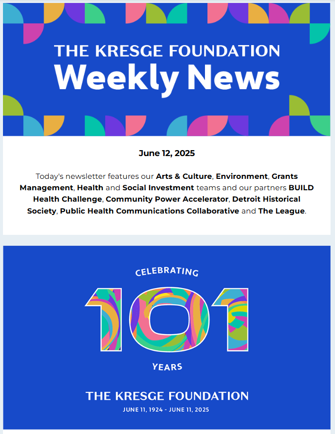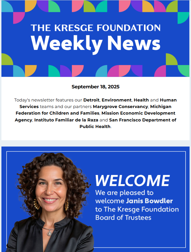 Issues of the weekly newsletter News From The Kresge Foundation, containing information about funding initiatives, events, research and our work to expand opportunity in America’s cities.