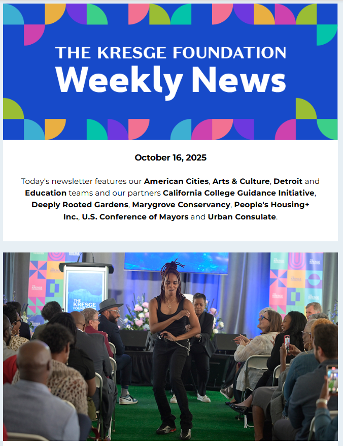 Featured items: Recap video captures excitement of Kresge’s historic $180M investment in Northwest Detroit; Just City Mayoral Fellowship open; Urban Consulate’s Daring Ideas for the Future series; College Guidance Initiative case study; Deeply Rooted Gardens reduces barriers for farmers of color; recent grant award: People’s Housing+ Inc.
