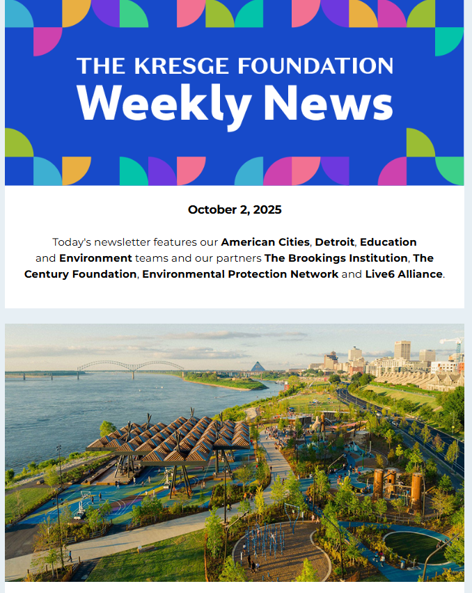 Featured items: Commentary by CEO Rip Rapson on Memphis, community safety and the deployment of the National Guard; report examines innovative approaches to financing climate resilience; new documentary on the legacy of HBCUs; a decade of Live6 and its impact; Kresge in the news; recent grant award: Environmental Protection Network