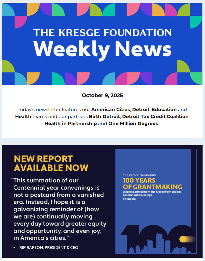 Featured items: Commentary by President Rip Rapson on “100 Years of Grantmaking: Lessons Learned from The Kresge Foundation’s Centennial Convenings”; Saunteel Jenkins rejoins Kresge’s Board; how Detroit Tax Credit Coalition recovers millions for families; 2026 Power-building Partnerships for Health Program, Birth Detroit promotes a community vision for families; recent grant award: One Million Degrees