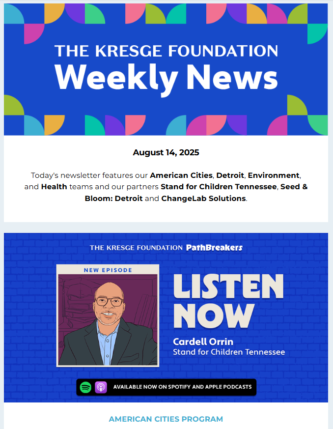 Featured items: PathBreakers podcast features Stand for Children Tennessee’s Cardell Orrin reflects discussing his educational activism journey; Kresge’s summer interns learn about philanthropy; young Detroit artists can find support for professional careers at The RED; Kresge Health Program Officer opening; recent grant award: ChangeLab Solutions