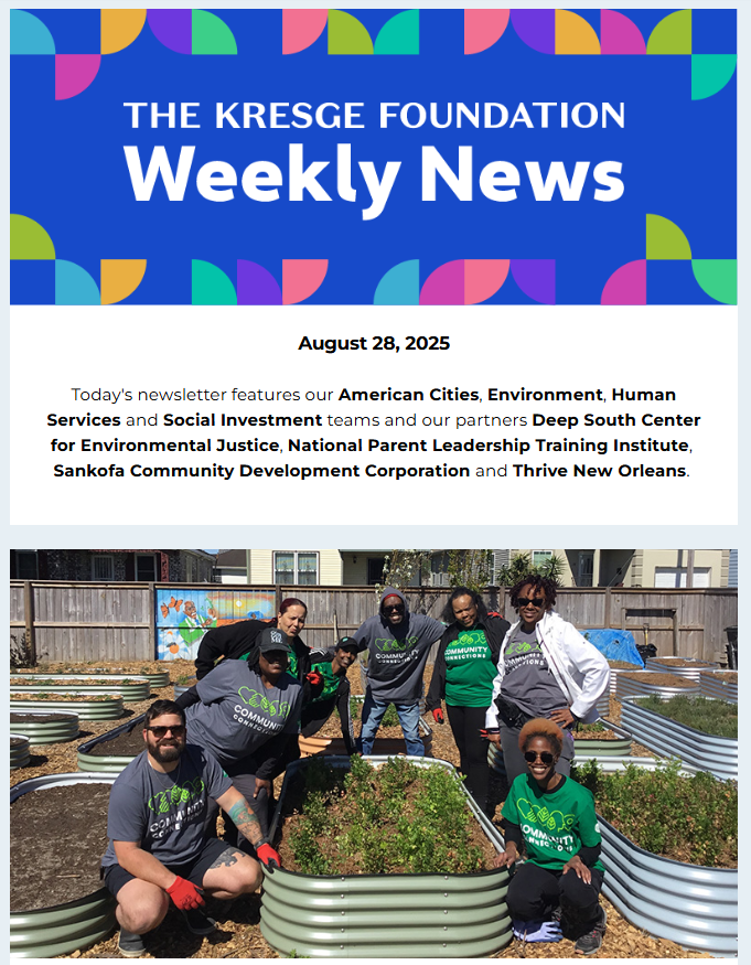 Featured items: Rip Rapson commentary on Kresge’s long view in New Orleans 20 years after Hurricane Katrina; PathBreakers podcast features Deep South Center for Environmental Justice’s Beverly Wright on her three-decade fight for climate justice; how philanthropy can save America’s research science crisis; Preserving place, creating opportunity: New Orleans’ path forward; fact Sheet on how Kresge invests in New Orleans; recent grant award: National Parent Leadership Training Institute