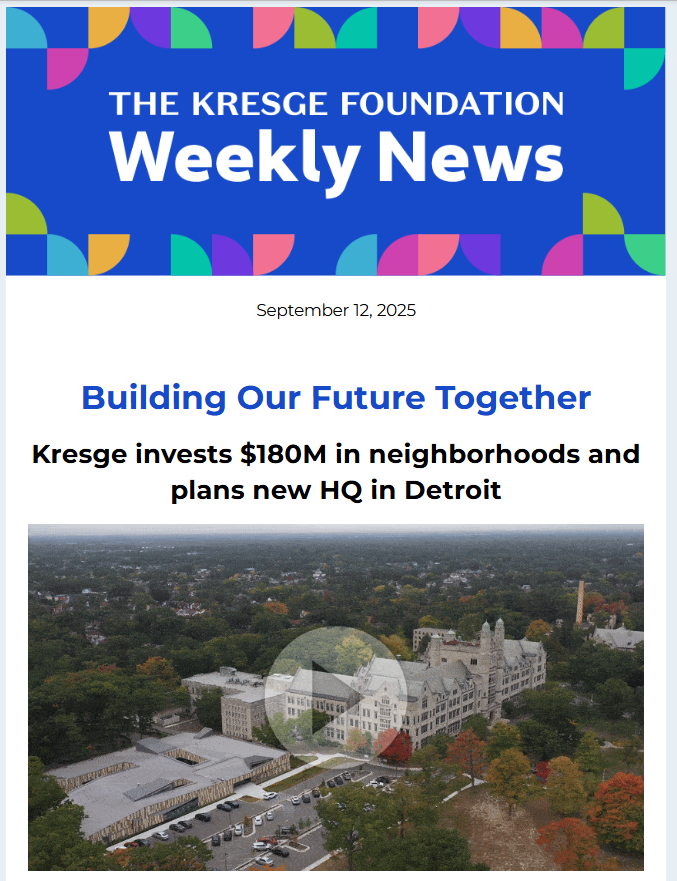 Special newsletter edition covers Kresge’s announcement that is it investing $180M in neighborhoods and plans new headquarters on the Marygrove campus in Northwest Detroit; details on transforming the campus and residents leading the way; frequently asked questions, remarks by Kresge President Rip Rapson