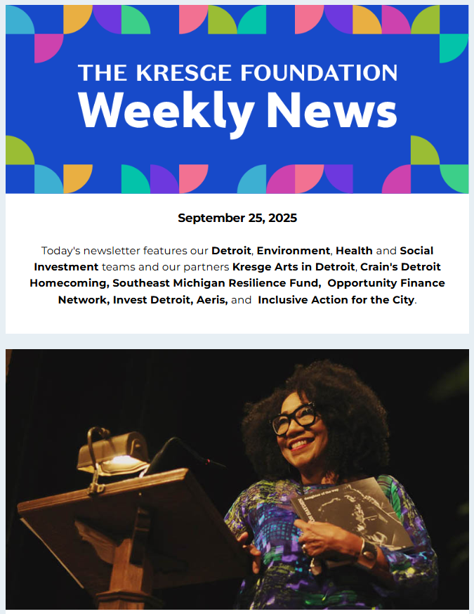 Featured items: Monograph for 2025 Kresge Eminent Artist Marion Hayden available now; Detroit Homecoming event with Richard Florida; Environment Program Officer Kat Sisler Q&A; Southeast Michigan Resilience Fund open now; What’s next for CDFIs? Three leaders share their vision; recent grant award: Inclusive Action for the City