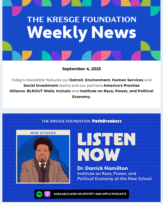 Featured items: PathBreakers podcast features Institute on Race, Power, and Political Economy’s Darrick Hamilton on how to advance intergenerational wealth; $3M loan guarantee to expand clean energy lending in Puerto Rico; how Detroit embraced murals as community assets; Kresge in the field; recent grant award: America’s Promise Alliance