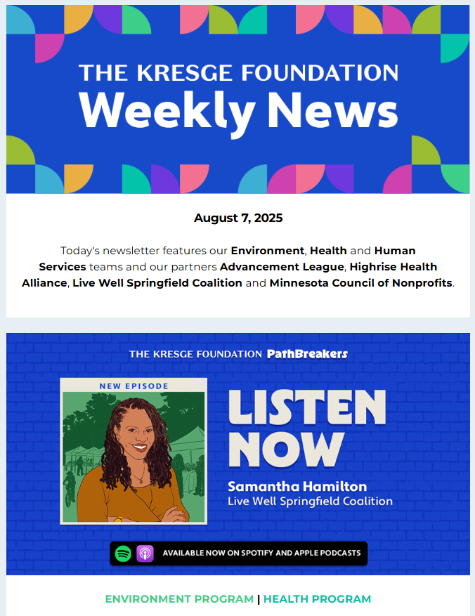 Featured items: Kresge to launch its first-ever podcast highlighting 12 visionary ‘PathBreakers;’ American Cities Program, investment and operations teams welcome new staff; Webinar: Get tops on how to apply ofr arts organization funding; Civic leaders discuss the transformative power of connecting community through greenways and public space; Toolkit offers messaging guidance on the connection between climate action and migrant justice; recent grant award: Build from Within Alliance.